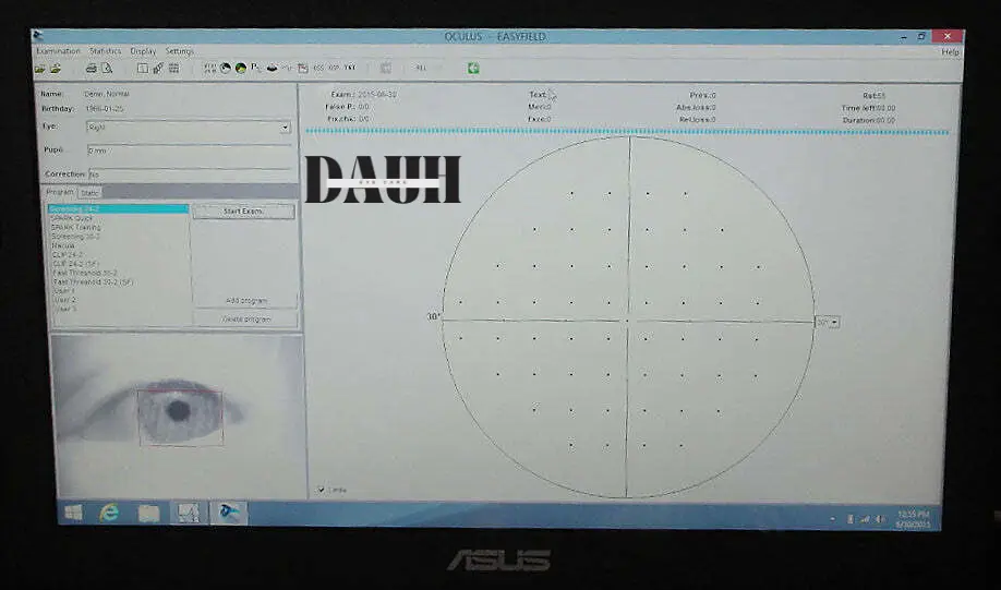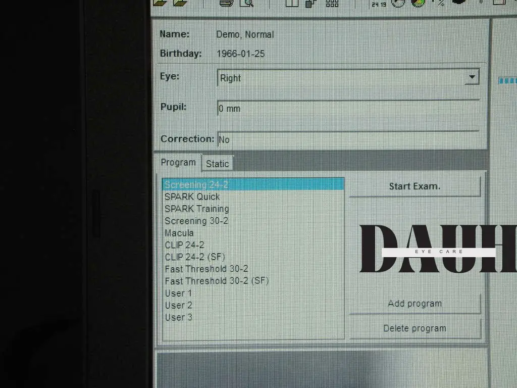- Pre-defined programs: general screening, glaucoma, macula testing, blepharaptosis (ptosis), and neorological testing